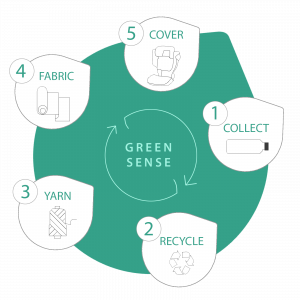 We continue to move forward in our efforts to all areas of sustainability — not just carbon emissions — in our seats. We develop seat cover material that consists of textiles made from recycled material such as PET bottles.